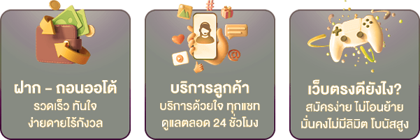ตอบ : - ฝาก-ถอนอัตโนมัติตลอด 24 ชั่วโมง - รองรับทุกธนาคารและวอลเล็ท - ไม่มีขั้นต่ำในการทำรายการ